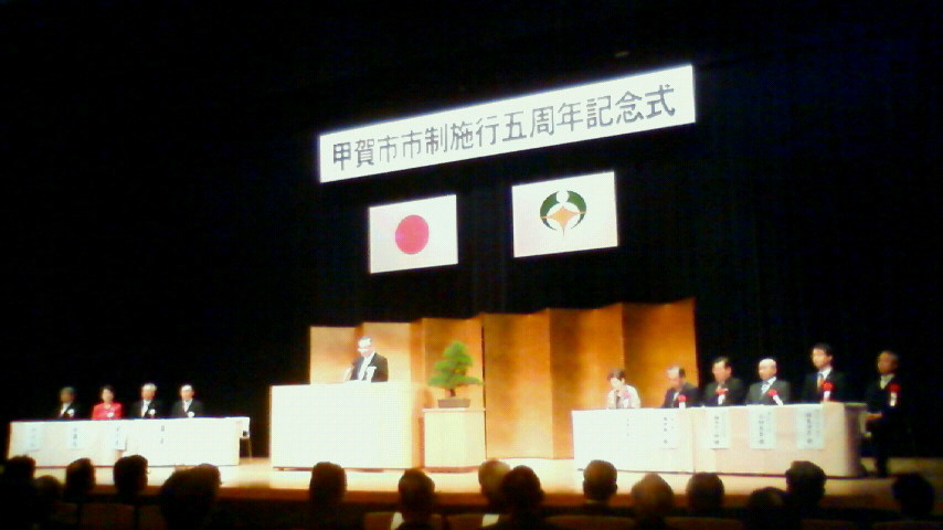 甲賀駅前イルミネーション さて、夕方よりは信楽高原鉄道の信楽駅前で開催されました、しがらき冬まつりイルミネーション2009に行ってまいりました。こちらも開催費が厳しい状況下でありながらも協賛金を集めるなどして例年に劣らない素晴らしい事業を開催しておられました。例年より開催時期が早いこともあり、比較的暖かいなかでの開催となりましたが、それでもやはり信楽は寒いです。冬の夜の屋外イベントではありますが、大勢の人出でにぎわっておりました。関係者の皆様大変お疲れさまでした。 しがらき冬まつりイルミネーション しがらき冬まつりステージ 甲賀市のあいこうか市民ホールにおきまして、甲賀市市制施行5周年記念式が開催され出席してまいりました。