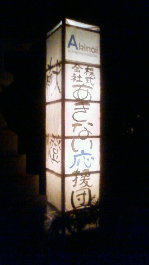 まぁ、毎年の事ながら開催間近になると様々な問題が勃発してまいります。今日一日だけでも、各担当から入れ替わり立ち代り様々な電話が掛かってまいりました。一難去ってまた一難。さすがに私ももうウンザリです。正直私もこれだけをやってるわけではございませんので・・・。 今日予定していたことの半分も消化することなく、ほとんどござれGO-SHU!の対応に追われる一日となりました。恐らく当日まではこんな調子で毎日が過ぎていくのでしょう。。。 さて、今宵は甲賀町は大鳥神社の大原祇園まつりの宵宮が開催されました。この大原祇園まつりは通称ケンカまつりとも言われ非常に見ごたえのある伝統あるまつりでして、私は大鳥神社の氏子ではないのですが、もうここ何年にもわたり仕事でお世話になっております。 そんな関係もありまして今年は初めて灯篭で奉納させていただきました。写真では大きさが分かりにくいですが、高さが3m近くある非常に大きなものでしてかなり存在感があります。(一対ですので実際には2本あります)思っていたよりよく目立ちますのでさすがに恥ずかしいです。ロゴはこちらから出力したものを用意させて頂きましたが、社名は手書きで書いていただいております。もちろん社名もロゴタイプがあるのですが、たまにはこういうのも味があっていいものです。ロゴタイプに合わせて応援団の応の文字だけ青色にして頂きました。