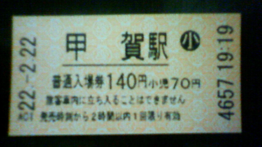さて、仕事を終え自宅に戻ると何やらテーブルの上に切符が! もしかして、記念切符?と思いきや、残念!普通の切符です。一応22年2月22日の日付ですが、自動券売機で購入した普通の切符で、「記念切符」ではなく、「記念に買った切符」のようです。 既に家のものは全て床についておりますので、どういう経緯で購入したものかよくわかりませんが、感熱紙タイプのこの切符は時間の経過とともに色が変色し、やがて字が見えなくなってしまう気がします。 やはり記念切符のように昔ながらの印刷の、しかも分厚いしっかりとしたタイプのものがいいですね。