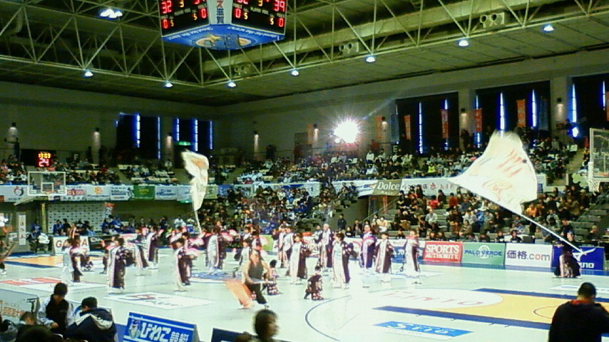 日曜日ということもあり、会場は地元サポーターの熱気に包まれ大いに盛り上がっていました。さすがの踊り子の皆さんも、この熱気に圧倒されて、いつもになく緊張気味でしたが無事演舞を終わらせていただきました。 ゲームの結果は残念ながら勝利には至りませんでしたが、ござれGO-SHU!としましても、初のバスケットコートでの演舞に新たなる可能性と同時に、様々な課題も発見することができ非常に良い経験をさせていただけたと思います。 頑張れ!!滋賀レイクスターズ! ござれGO-SHU!も頑張ります! 毎晩帰りが遅いのと、帰ったときには酔っておりますのでなかなか毎日更新できないものです。