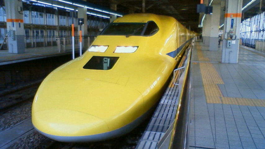 何かといいますと東海道山陽新幹線を走る、通称「ドクターイエロー」と呼ばれる新幹線電気軌道総合試験車で、見た目は700形新幹線の黄色版という感じの車両です。約10日に1度ぐらいの割合で、線路の検査をしながら東京~博多間を2日かけて1往復しているらしく、そのスケジュールと運行ダイヤは一般には公開されておらず、インターネット上で熱心なファンの方々が運営されるサイト等で、運行予想的なものが公開されているだけです。どうやらそれが14日、15日に走るという情報を入手したらしく、見かけたら写真を撮っておいて欲しいとのコトです。 ならば駅員に聞いてみようと昨日博多駅に到着した際に、窓口でドクターイエローの件について質問すると、14日は19:30ごろ到着で、15日は9:00ごろ出発しますとの情報を教えていただきました。 そこで、朝からわざわざこのドクターイエローの写真を撮るために、博多駅に行ってまいりました。(といっても、駅前のホテルに宿泊しておりましたのでスグですが) 発車予定の電光掲示板には次発「923号 回送」と表示されています。なるほど、これがドクターイエローだなと思いながら、そのホームで携帯のカメラを片手に構えていると、間もなくドクターイエローがホームにその姿を現しました。前方の写真と後方の写真をホームでひとり走りながら必死で撮ってまいりました。周りからはかなりの鉄道好き?に見えていたのではないでしょうか・・・。乗務員が乗り込み、時間にして約5分ほど停車していたと思われます。東京に向けてゆっくりと出発していきました。 新大阪で一旦、大阪第一車両所に入ってから東京へ向うようで、ウチの子どもたちは大津市のフォレオ大津の展望台からドクターイエローの通過を見ていたようで通過時刻は14:30ごろだったようです。ちなみにフォレオの展望台では多くの鉄道ファンの方がおられたらしいです。 まぁ個人的にはあまり興味がないのですが、その希少性からちょっと自慢げにブログに書いてみました(笑)