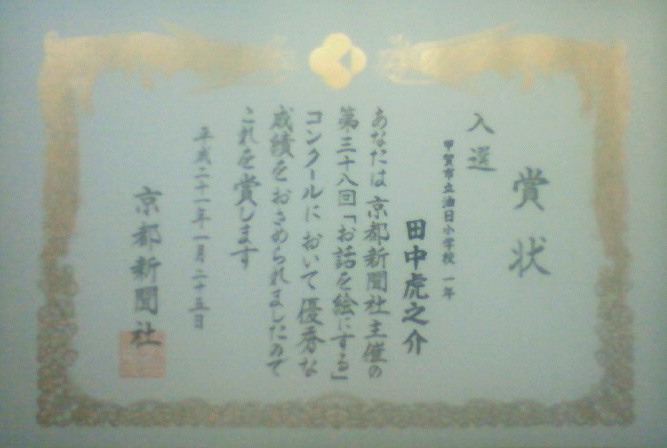 現在「花風香の湯」は甲賀市の指定管理者制度により大阪の某業者が運営をしている状況で、その期限が今月末で切れるそうです。甲賀市からは現在の業者に対する指定管理の更新の予定は無いとのことで、それに替わる指定管理の入札等も実施されておらず、このまま今月末以降は閉鎖になるような雰囲気です。 甲賀市自体も財政難で、行政としてこのような施設を維持することに限界が生じたのか、来客数減に起因する運営業者の収益悪化が原因なのか真相が不明なため、後日そのあたりについての話し合いの場を設けていただきます。数少ない観光資源のひとつでもあり地元NPOとして、このような問題に直面している現状を市民レベルでなんとか解決できる方策はないものか検討するため、取材を行い情報収集したうえで再度報告をさせていただきます。 京都新聞社主催の第38回お話を絵にするコンクールでウチの長男の絵が入選し、このほど小学校から賞状をもらって帰ってきました。昨年の第37回でも保育園から出品していただいたのが入選をし、何と2年連続の入選です。私は見にいけませんでしたが県立美術館にて展示をされていたようです。