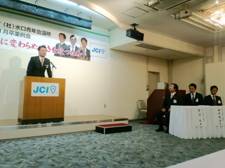 14日、日曜日に大津市のアルマーレにおきまして、社団法人水口青年会議所の11月度例会、卒業例会が開催されました。本年の卒業生は3名で、うち2名は私と同期入会で、うち1名は私の4年あとの入会です。