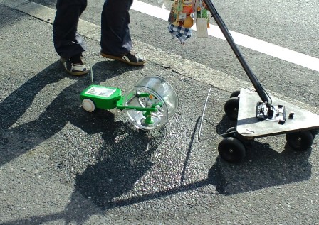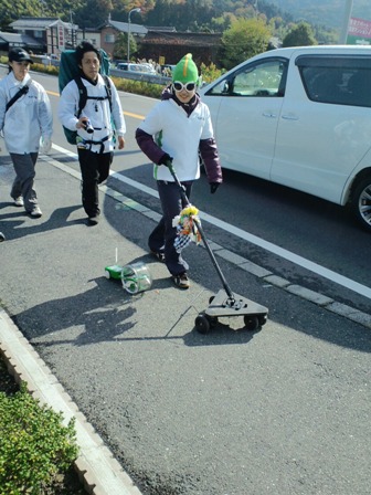 9月23日に日本橋をスタートし、東海道五十三次の旅に挑戦中のパナソニックの充電式エボルタを使用したロボット「エボルタ君」がついに昨日甲賀市にやってまいりました。日本橋のスタート時点からホームページやツイッターで進捗状況を確認しておりましたが、一昨日、甲賀市の49番目の宿土山宿、昨日は50番目の宿水口宿を出発し、湖南市の石部宿を向かう途中の様子を見てまいりました。