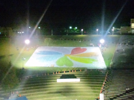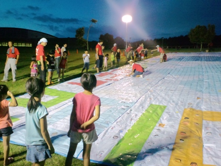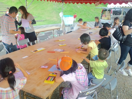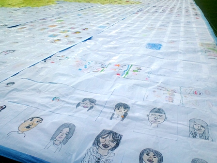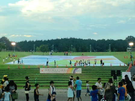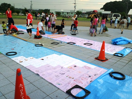このイベントは甲賀市、湖南市内の小学校や幼稚園をはじめとする市民の皆様方にA4の用紙に笑顔の絵を書いていただき、それらを色別に並べて巨大なモザイク画にし、その大きさでギネスに挑戦するというものです。 当日は天候に恵まれ、多くの方々にお越しいただきました。 各セクターより飲食ブースを出店していただきました。 おかげさまで各ブース完売です。 当日も多くの方々に絵を描いていただきました。 書いていただいた絵を張り合わせて行きます。 ステージイベントも盛りだくさんで、GO-SHU!戦隊ござれんじゃーも登場です! 一枚一枚の絵にいろいろな想いがこめられています。 遠くから見るとこんな感じです。 最後の作業を市民の方々と一緒に行います。 世界記録達成! A4用紙16,436枚の巨大モザイク画です!! 22mの高所作業車で上から撮影しました。 ご協力いただきました市民の皆様ありがとうございました。 また、担当委員会の方をはじめ、メンバーの皆様お疲れさまでした。