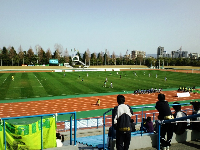 サッカーJFLの開幕戦が滋賀県大津市の皇子山競技場グラウンドにて開催されました。MIOびわこ草津VSジェフリザーブズ戦は、開始6分でMIOびわこ草津が先制点を決めると前半に合計4点、後半に1点を入れ5-0でMIOびわこ草津が勝利を飾りました。ちなみに私は番組ロケという名のもと、ただひたすら観戦しておりました。